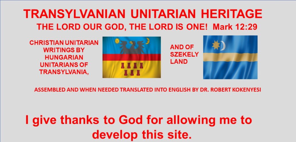 Welcome to the web site Transylvanian Unitarian Heritage. This site is built for English speaking religious scholars, and other individuals interested in educating themselves about the source texts of the Transylvanian Unitarian religion. All translations (unless otherwise noted) are the works of Dr. Robert Kokenyesi, the operator of this site.